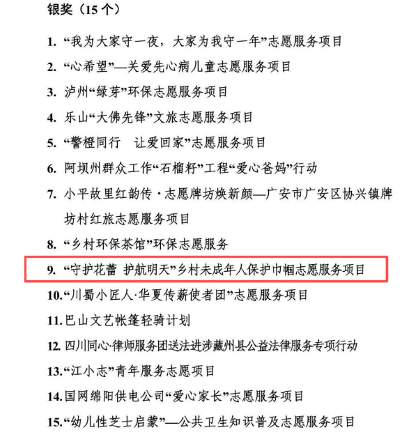 11月24日,四川省首届志愿服务项目大赛落下帷幕,泸州市妇联“守护花蕾 护航明天”乡村未成年人保护志愿服务项目进入决赛,通过路演和答辩,综合初审结果,从全省177个选送项目中脱颖而出,获得银奖!