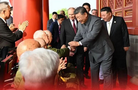 9月3日上午,纪念中国人民抗日战争暨世界反法西斯战争胜利80周年大会在北京天安门广场隆重举行。习近平总书记等登上天安门城楼。习近平总书记同抗战老战士老同志代表亲切握手,向他们表示崇高敬意。